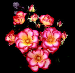 Bud pointed. Flowers rosy edged fading to white, yellow at base, bright stamens, 6-12 petals, 4 in, borne in small clusters of 3-5 flowers; moderate fruity fragrance; floriferous; new growth dark red; rounded, bushy, 4 ft (120 cm). Recurrent